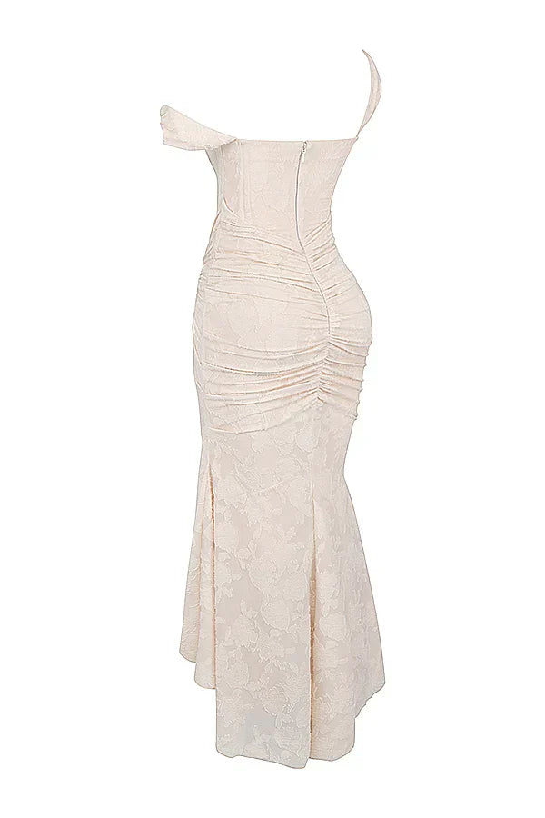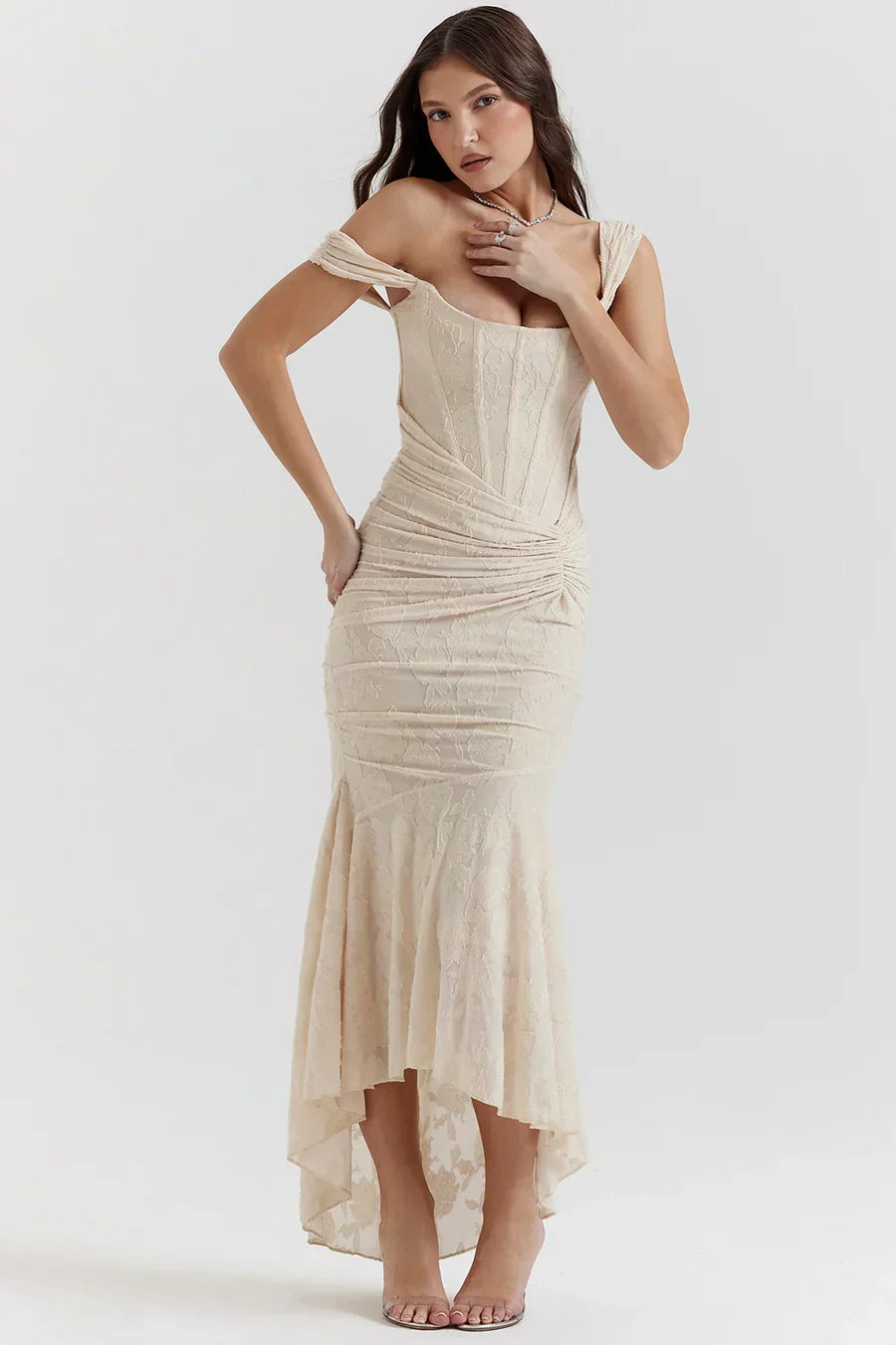 Het korset sluit mooi aan en accentueert je figuur, terwijl de gedrapeerde details rond de taille zorgen voor een vrouwelijk silhouet. De off-shoulder bandjes geven een romantische en sensuele touch, en de fishtail-zoom met lichte high-low afwerking beweegt sierlijk met je mee.