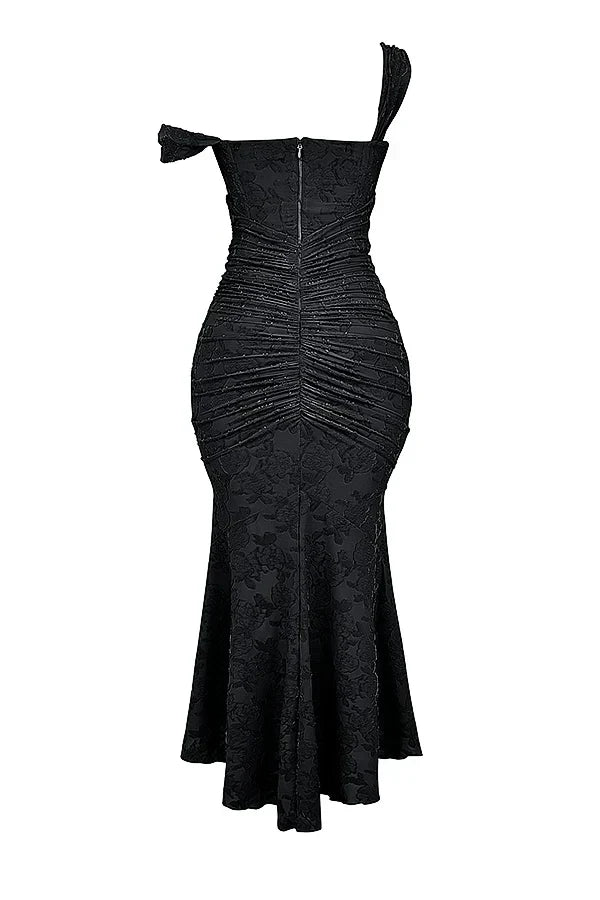 De Celestia Avondjurk is de ultieme avondjurk voor wie stijl, elegantie en verfijning wil uitstralen. Deze jurk is gemaakt van luxe jacquardstof met een subtiel bloemenpatroon dat zorgt voor diepte en een chique uitstraling.